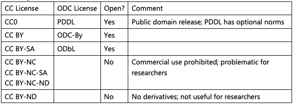 Open Data Commons, created in 2007, has a set of three open licenses for data: the Open Data Commons Open Database License, aka “Attribution Share-Alike for data/databases”, the Open Data Commons Attribution License, aka “Attribution for data/databases”, and the Open Data Commons Public Domain Dedication and License (PDDL), aka “Public Domain for data/databases” (Open Knowledge Foundation, n.d.-c). Along with the PDDL license, Open Data Commons provides a set of Community Norms that can be appended. Open Data Commons and Creative Commons discuss the differences between their licenses, both pointing out that CC licenses are intended for a broader set of artifacts and only those subject to copyright, while the Open Data Commons licenses are specific to databases.